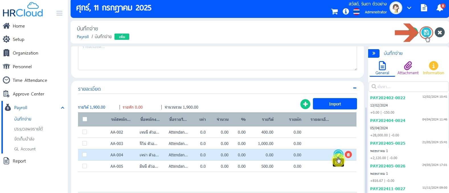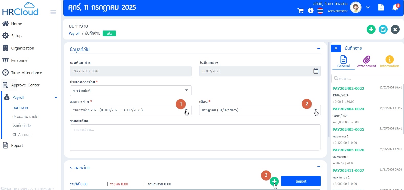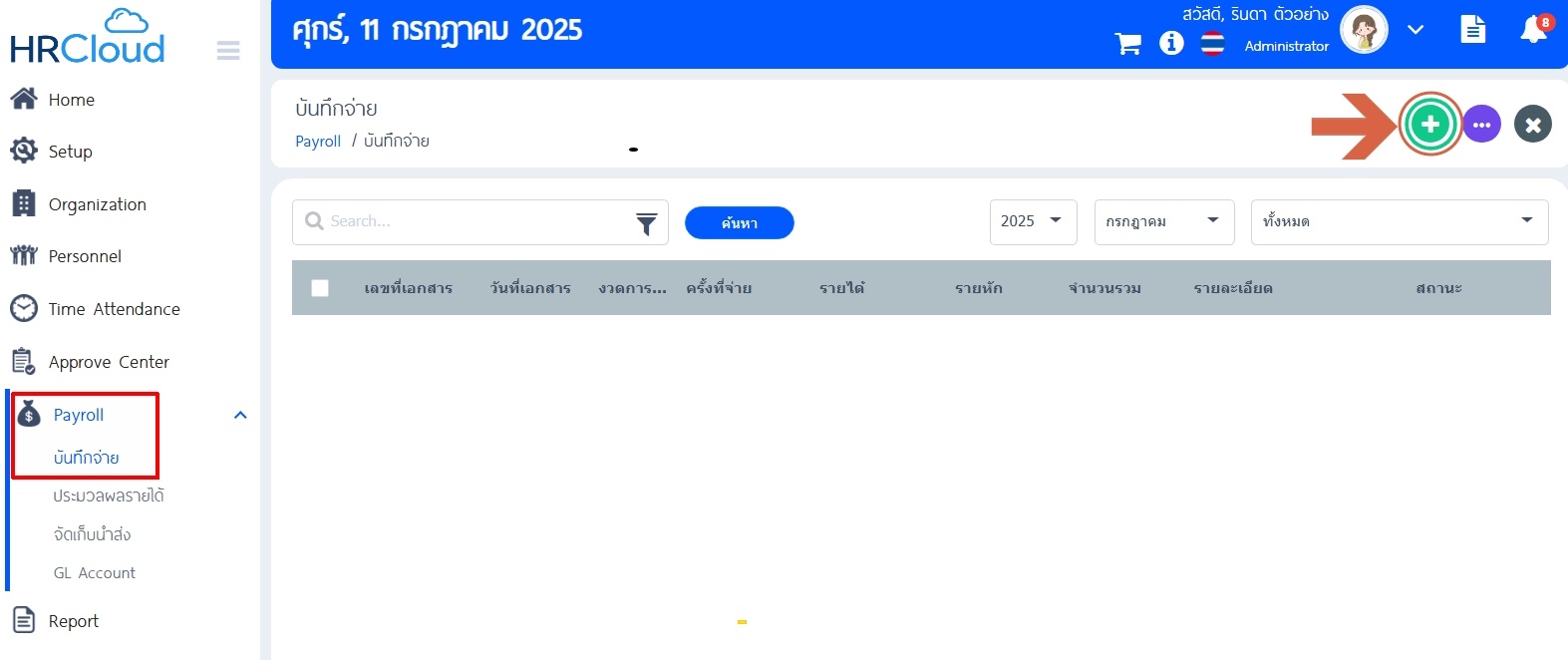 1. ไปที่ฟังก์ชั่น Payroll > บันทึกจ่าย และกดบวกเพิ่มสีเขียว