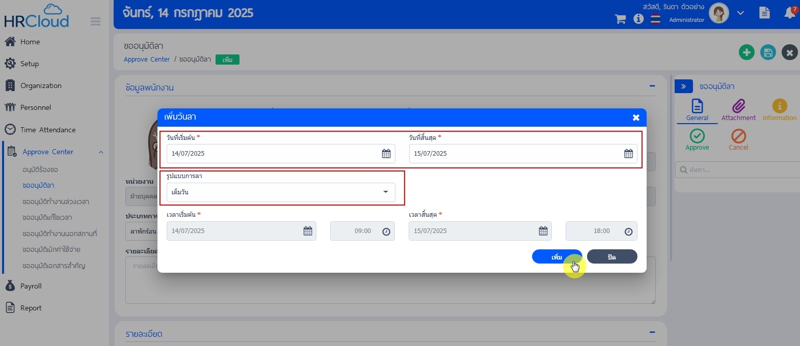 3. กำหนดวันที่ลา และเลือกรูปแบบการลา กดเพิ่มข้อมูล