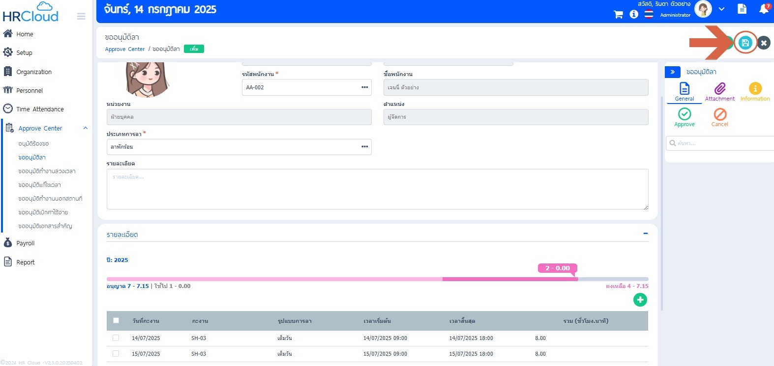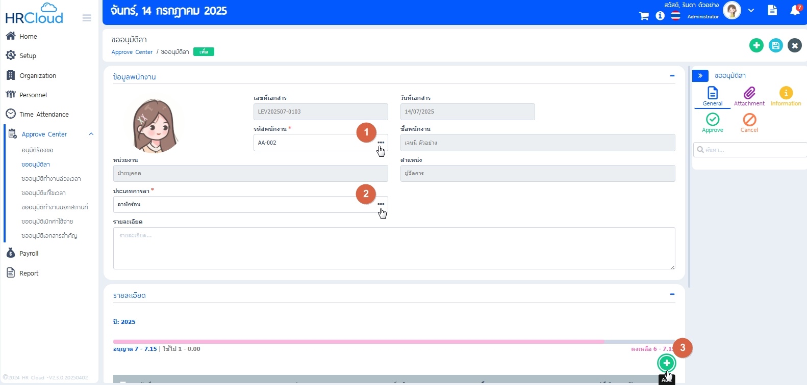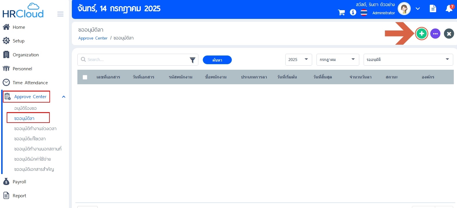 1. ฟังก์ชัน Approve Center เลือกขออนุมัติลา และกดบวกเพิ่มสีเขียว