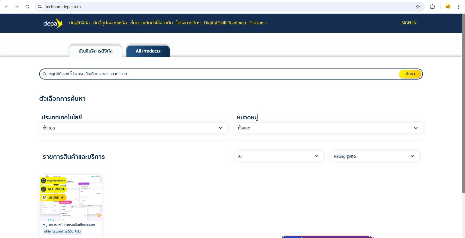 ค้นหาชื่อ myHRCloud โปรแกรมเงินเดือนและลงเวลาทำงาน  เพื่อเลือกดูสินค้าที่ขึ้นทะเบียน