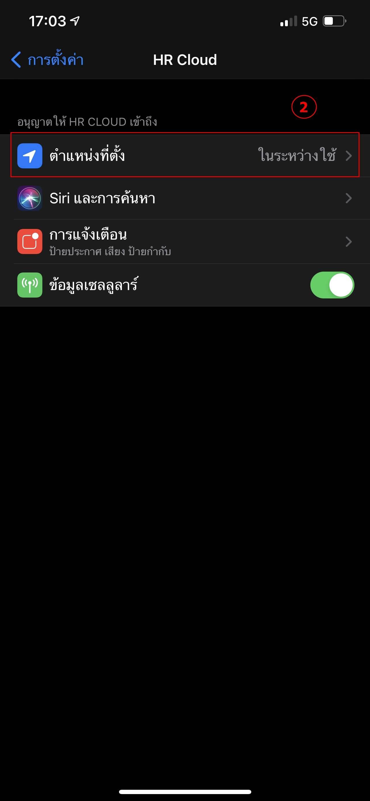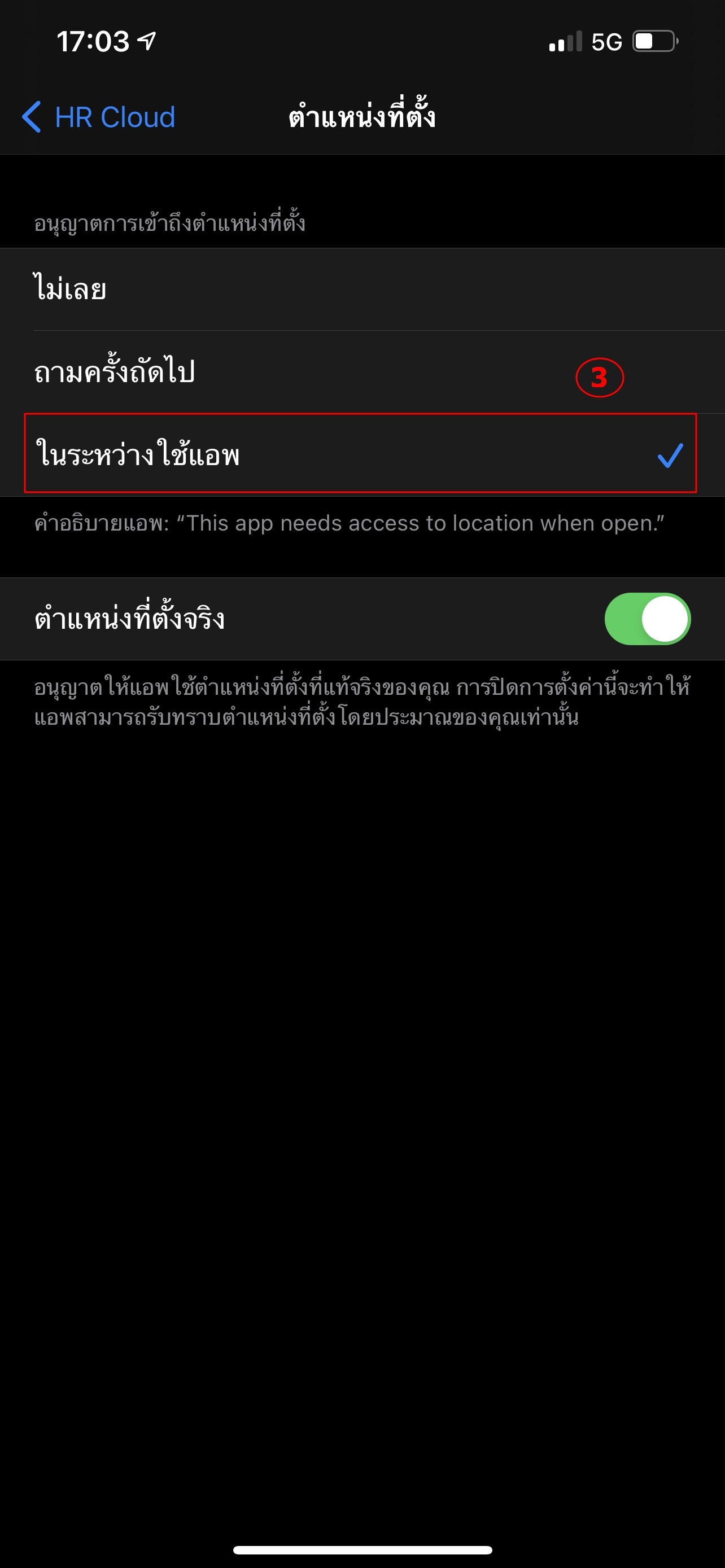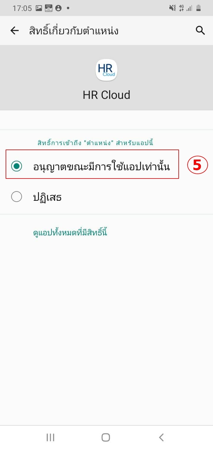 ขั้นที่5 เลือก ให้เป็น ในระหว่างการใช้วิธีการแก้ไขกรณีของ Application HR Cloud บน iosขั้นที่1 การตั้งค่า > HRCloudขั้นที่2 เลือก > ตําแหน่งที่ตั้งขั้นที่3 เลือก > ในระหว่างใช้แอพ