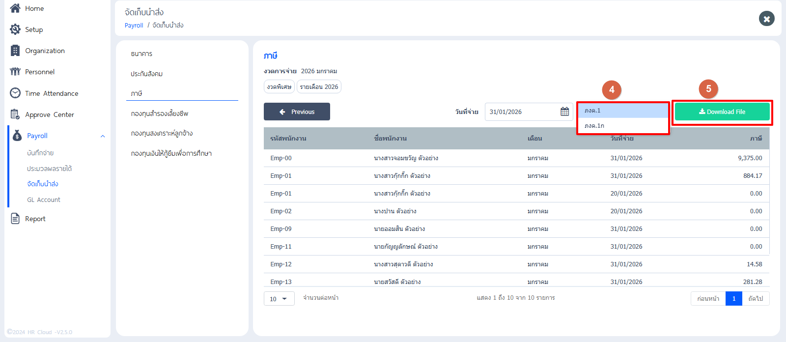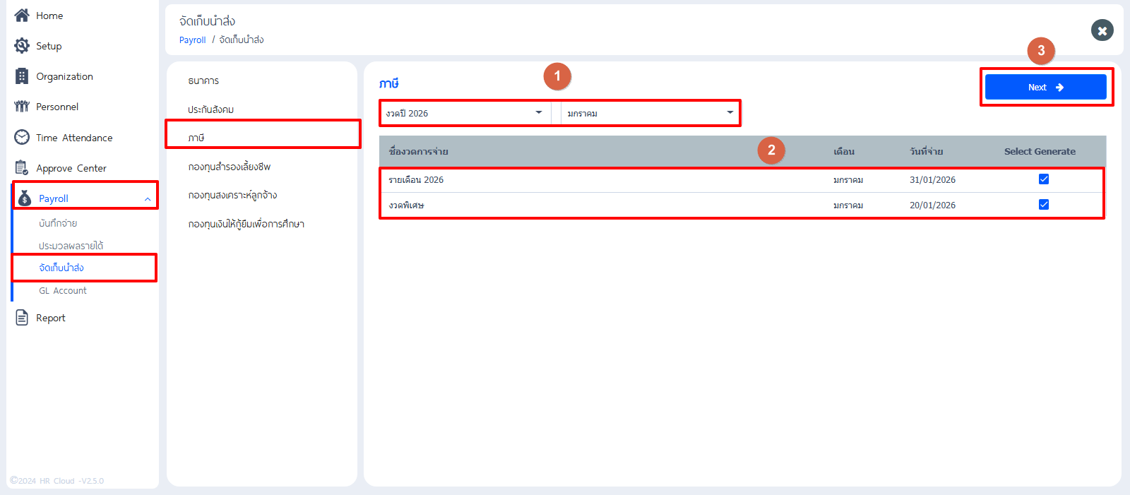 FAQ – การจัดเก็บนำส่งภาษีโปรแกรม HR Cloud สามารถจัดเก็บข้อมูลนำส่งในรูปแบบของ Text file ตามขั้นตอนดังนี้ขั้นที่ 1 ไปที่ฟังก์ชัน Payroll > จัดเก็บนำส่ง > เลือก ภาษีขั้นที่ 2 เลือกข้อมูล