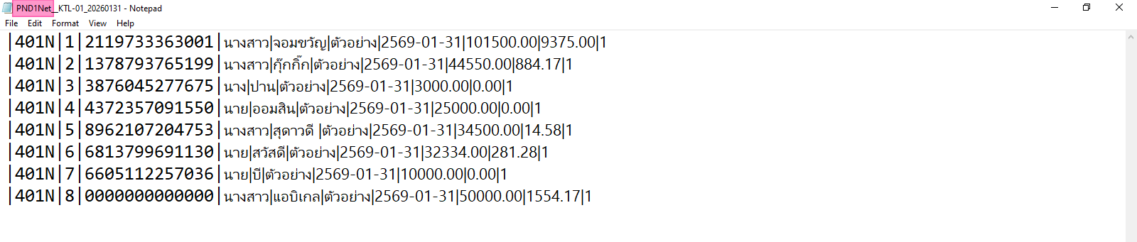 ขั้นที่ 3 สามารถเลือกรูปแบบภาษี ภงด.1 และ ภงด.1ก ตรวจสอบรายละเอียดของข้อมูลให้ถูกต้องก่อน ขั้นที่ 4 เมื่อ ข้อมูลที่จะ Generate ออกมาจะเป็น Text file > ลักษณะ Text File ที่ได้จากการ ในโปรแกรม HR Cloud * File (Text File) PND1Net.txt ใช้สำหรับการยื่นภาษี ภงด1 * File (Text File) PND2.txt ใช้สำหรับการยื่นภาษี ภงด1ก